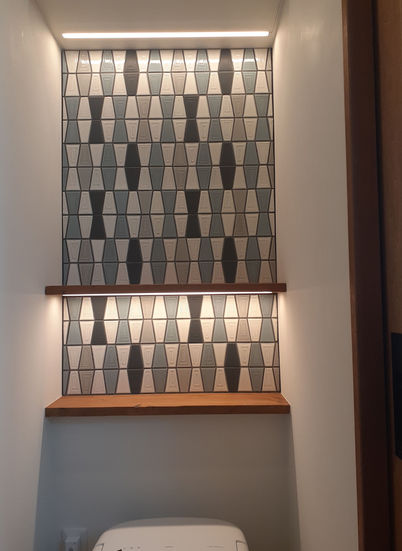 トイレの一壁面をモザイクタイルで施し、間接照明の光により柔らかく、淡い感じを演出している。